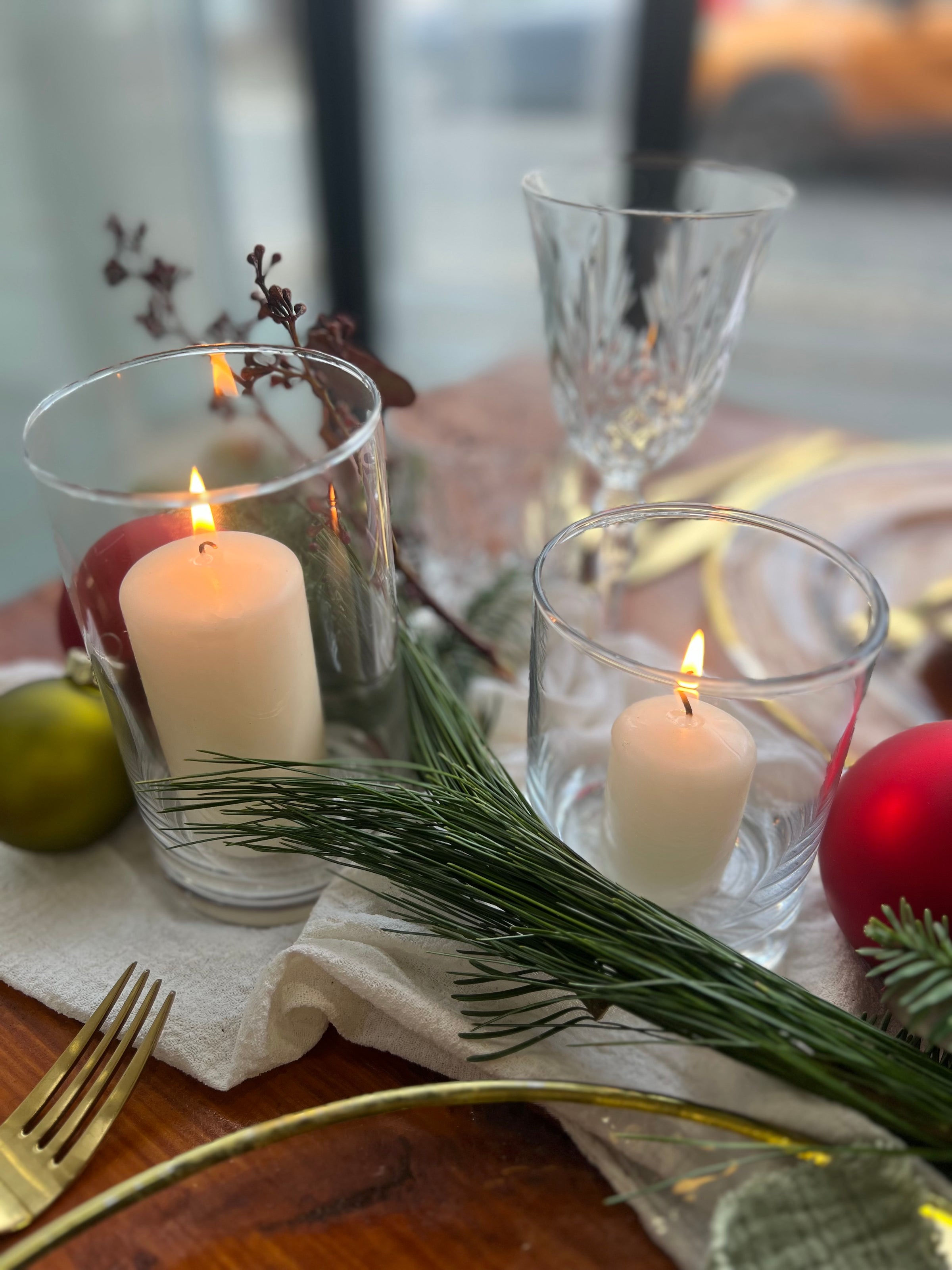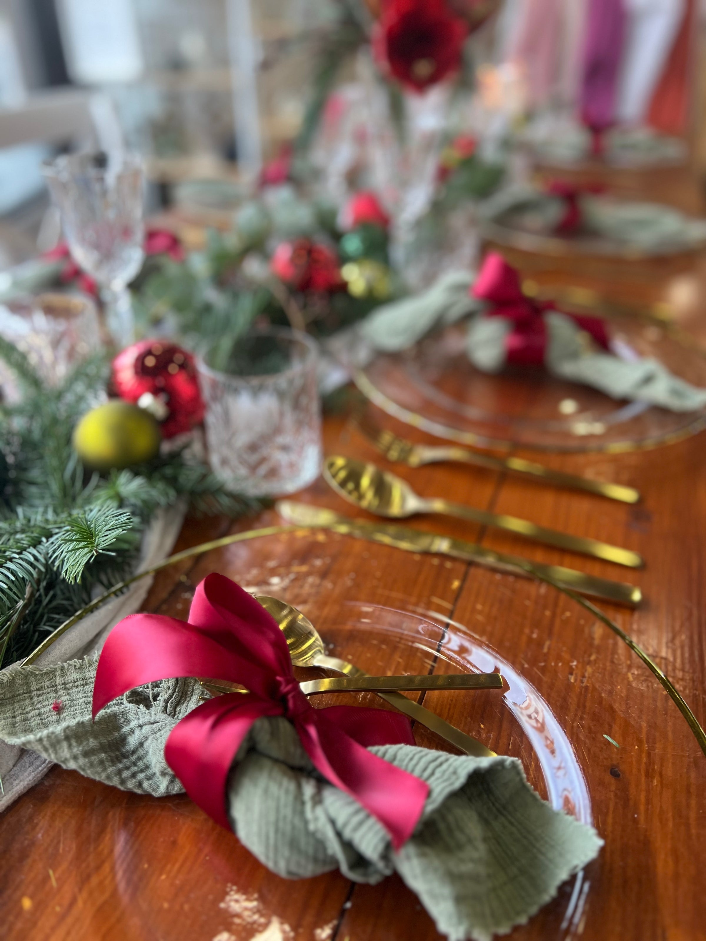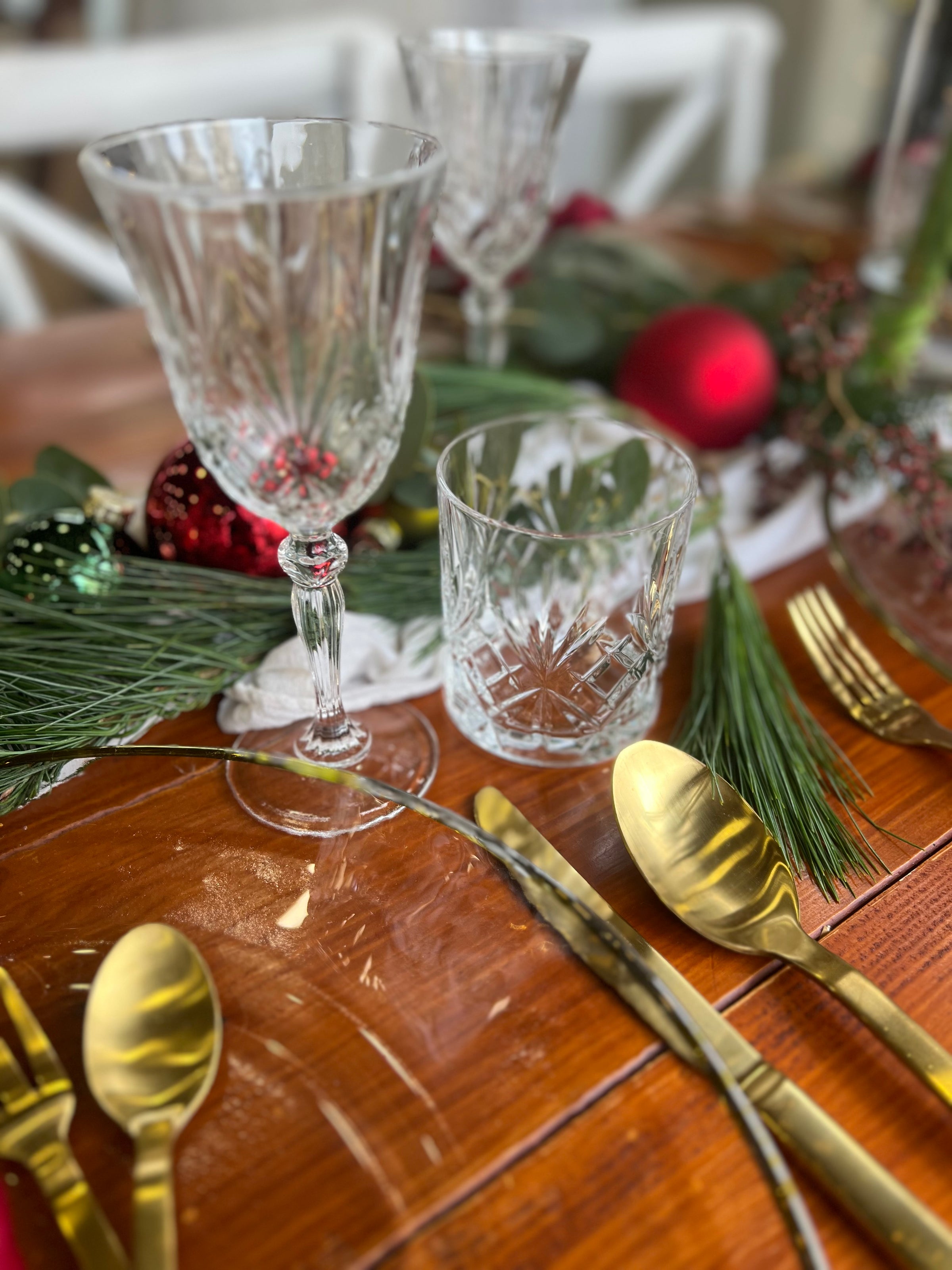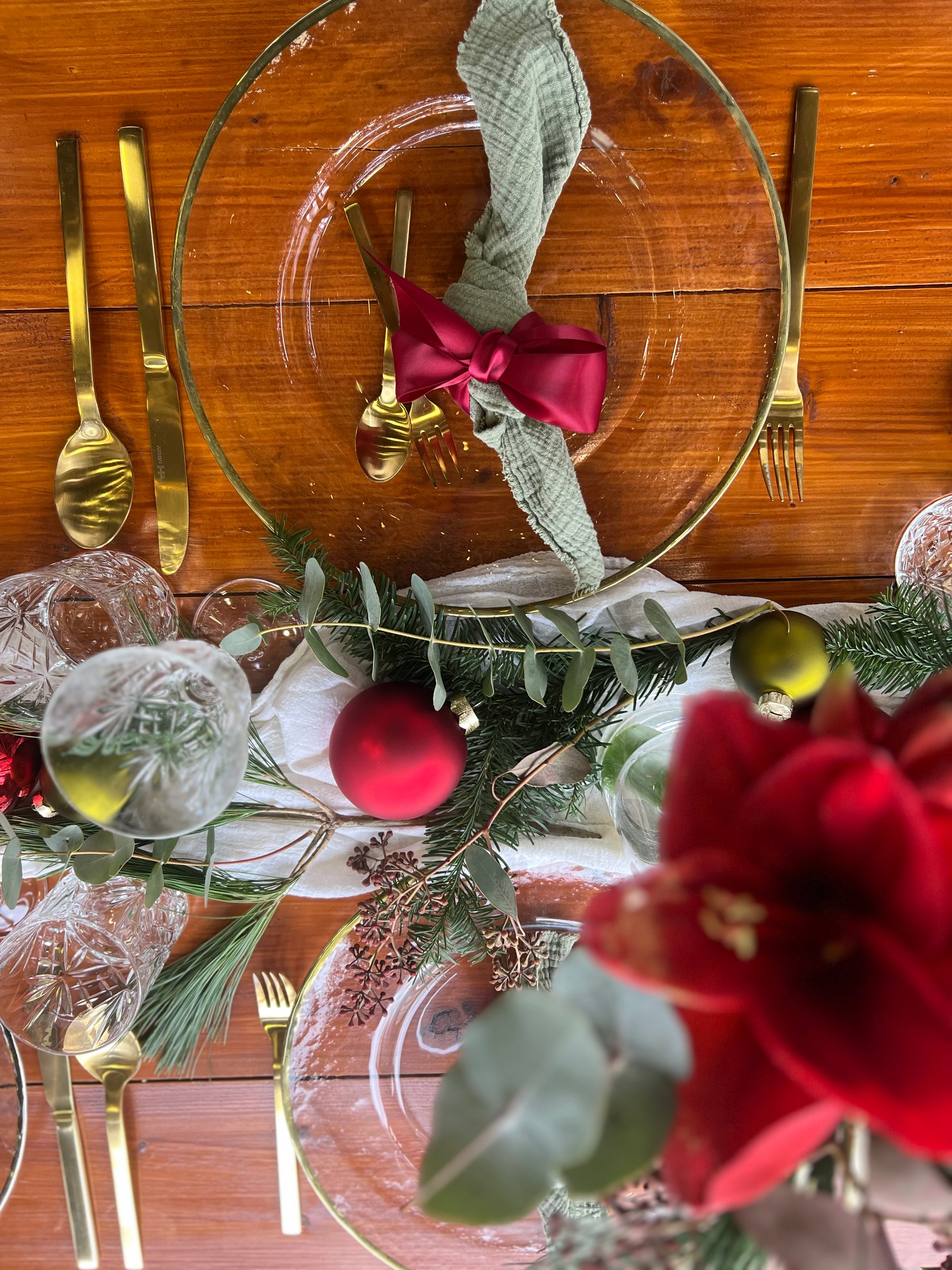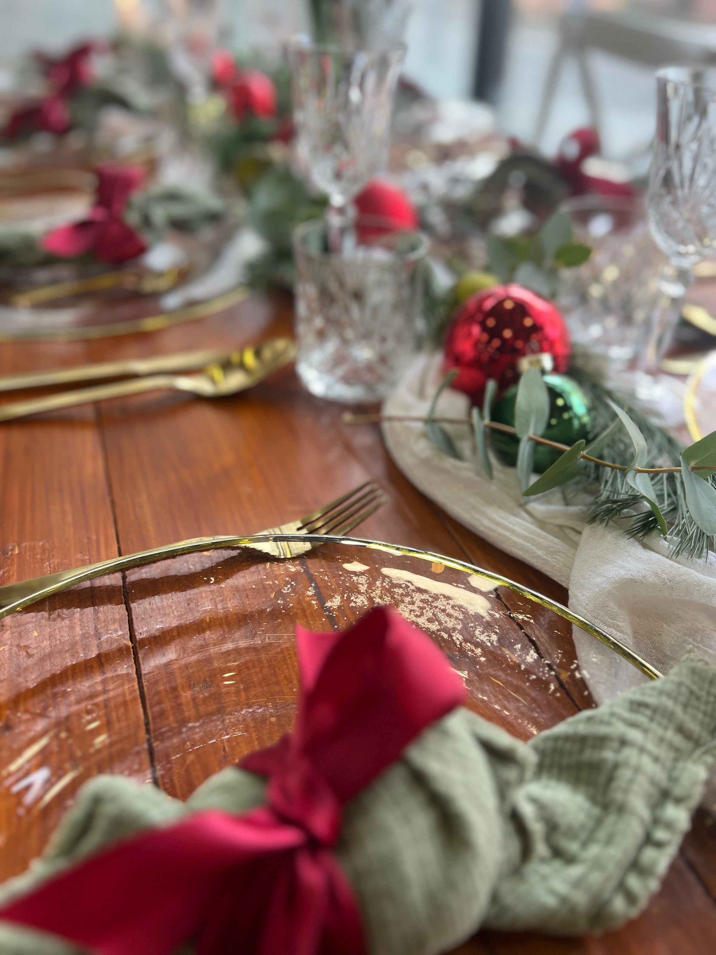 Dieses Paket beinhaltet alle Mietartikel, die du auf den Fotos siehst. Das Konzept kombiniert warme, weihnachtliche Elemente mit edlen Akzenten in Gold. Das goldene Besteck und die Glasplatzteller mit feinem Goldrand verleihen der Tafel einen festlichen Glanz, während die Greenery-Servietten eine natürliche, winterliche Note einbringen. Die hochwertigen Kristallgläser für Wasser und Weißwein runden das Gesamtbild stilvoll ab und sorgen für eine elegante Atmosphäre.